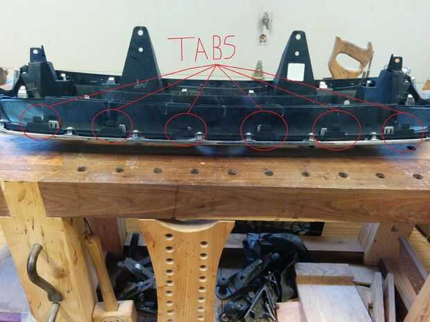 Por último, se debe sobre lengüetas de plástico (8) a lo largo de la parte inferior que sostiene la parrilla en su lugar. Hay (2) grandes por las linternas y los más pequeños (6) a lo largo del centro. Usted debe ser capaz de sentir con los dedos y, mientras tira suavemente hacia atrás en la parrilla, pop les hacia arriba y hacia fuera uno por uno hasta que la unidad entera está hacia fuera.