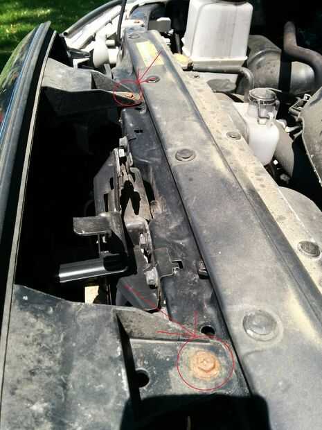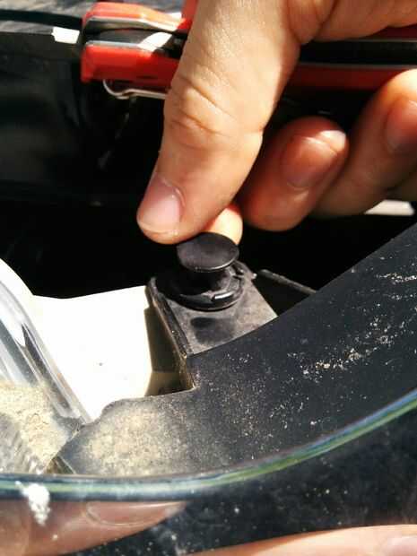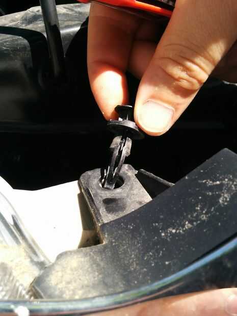 Primero, retire (2) pernos de 10mm de la parte superior de la parrilla con la cabeza de phillips o la toma de corriente. Después de eso debe ser pop (2) clips junto a los faros (1) a cada lado. Todo lo que tienes que hacer es levantar ese centro del círculo con cualquier cosa plana y todo el clip deben subir.