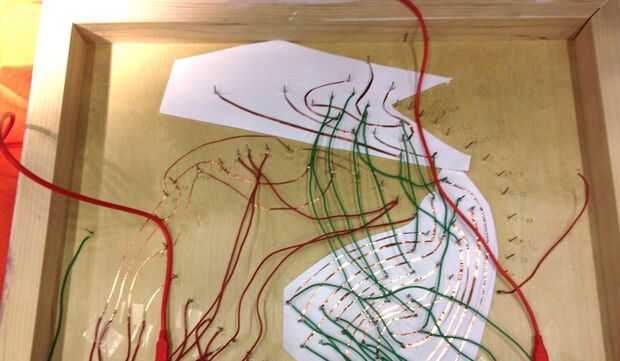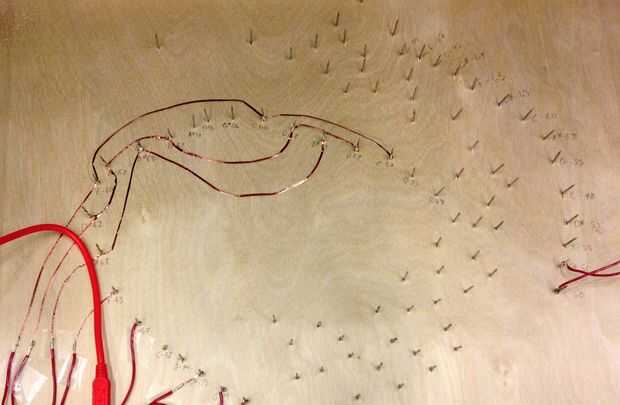 Conectan los clavos a las entradas de su placa/s. Se utilizó una mezcla de soldado los cables y cinta de cobre. Si tu pintura es compleja, es útil etiquetar todas las uñas con un lápiz en la parte posterior. Tenga en cuenta cuantas entradas que tienes disponibles en tu placa/s. Nos a menudo interconectadas múltiples formas a la misma entrada para reducir el número de entradas que necesita.