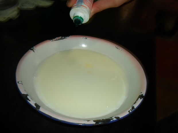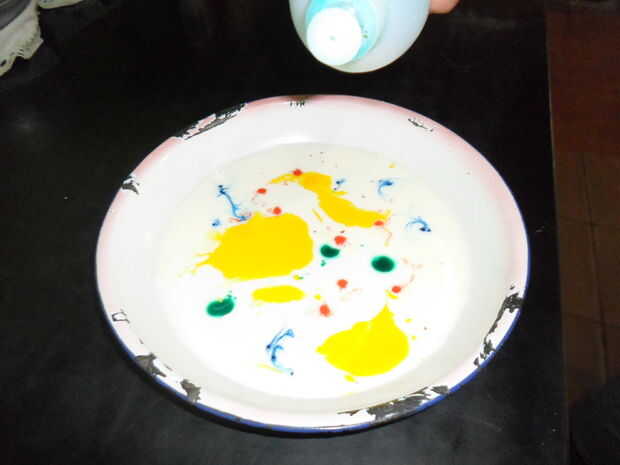 • Añadir unas gotas de colorante en la leche tratando de poner una cantidad aproximadamente igual de cada tinte colorante. • Después de unas pocas gotas de detergente en la mezcla, capaz de disolver el detergente causará una reacción de la dispersión del colorante de diferentes maneras, dando un aspecto psicodélico.