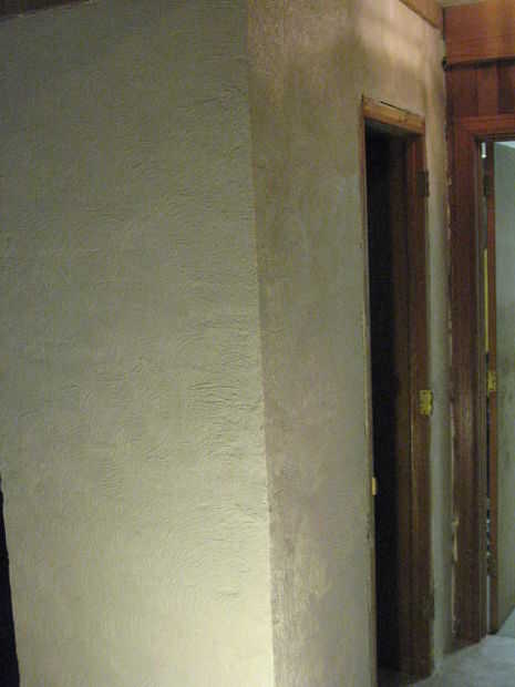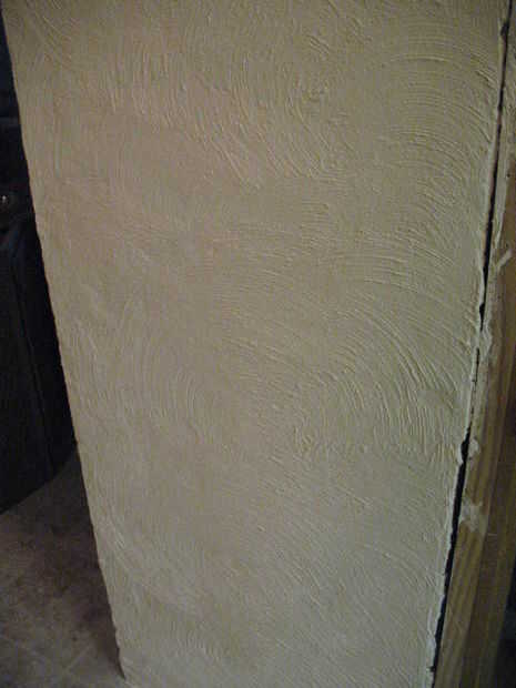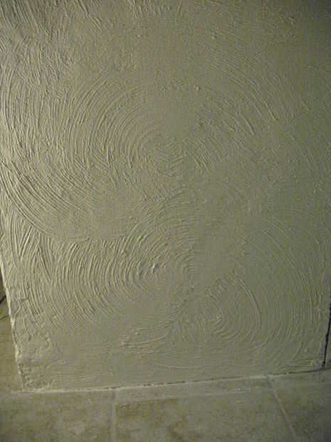 También queríamos tener un patrón de remolino como ves en las paredes enyesadas en el aspecto final, por lo que aplicamos la pintura en secciones de 3 pies x 3 pies; antes de que la pintura tenía una posibilidad de configuración o seco, utilizamos un pincel a pincel de cerdas duras en los patrones del remolino. Repetimos este proceso para la Fundación de todo bloque de hormigón.