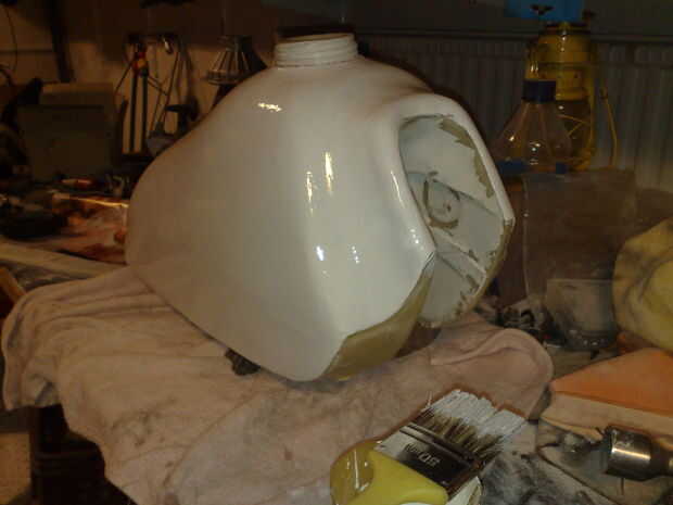 La piel está hecha de fibra de vidrio vowen, epoxi, masilla y pintura. Es posible que basado en la resina del poliester se puede utilizar en lugar de epoxi pero no lo recomiendo. Poliester curado permitirá vapores a través de y el riesgo de terminar con una piel con el mismo problema debido a que el tanque no es atractivo.