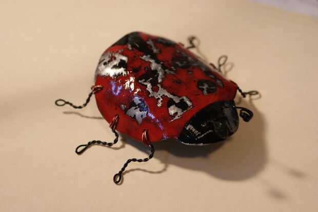 Ahora, tome un papel de lija de 120 grano y empezar a lijar todo sobre la espalda. A través de la arena al metal en los bordes de la mariquita y en los pies, pero no de la arena a través de la mayoría de las áreas rojas. Empuje hacia abajo de la lija con el dedo a la arena en las marcas de rascado que has hecho. Esto será lijar la pintura negra, que un polvo negro fino. Eso polvo negro se atranca en la pintura roja suave y aspecto de suciedad y hollín. Hacer este donde que quieras hasta tener el aspecto que desea.