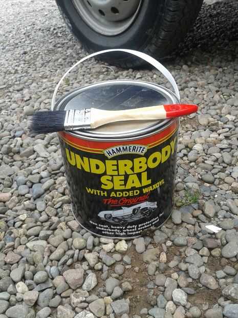 Para comenzar con usted necesitará algunas herramientas. Obviamente necesita pintura. Usé una lata de sello de la parte de abajo de capa Hammerite que compré por menos de £12. Se hace con waxoyl y se seca a un pegajoso final. Esto significa que cualquier piedras no astillen, y cualquier flex saldrá indemne. También compré un pincel desechable barato de 40mm de ancho. Esto cuesta p 99 entrega de amazon. Así como estos, necesita un rollo de cinta de enmascarar de pintor. Ni idea lo que esto cuesta, pero me enteré algunos en mi cobertizo, es barato aunque. Además de éstas necesita un cubo o dos, una esponja o depurador de errores y algo de jabón, así como un cepillo de alambre.