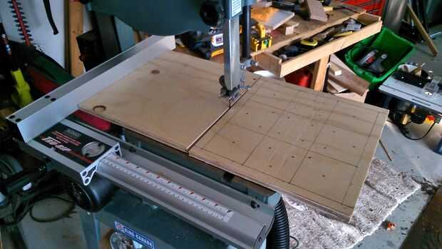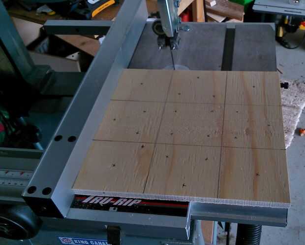Cortar la madera contrachapada de 12 x 24 x 1/2 pulgada en 2 trozos del mismo tamaño. Uno se utiliza como el tablero del forro y el otro para el marco y plazas. Mi plazas no son perfectamente cuadrados para arriba. Sólo establecer mi cerca de Sierra de banda a 3,5 pulgadas y tratar de hacer plazas la última fila no es perfecta pero eso no importa. Este proyecto no necesita ser un perfeccionista