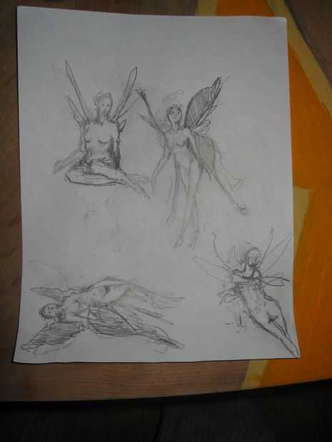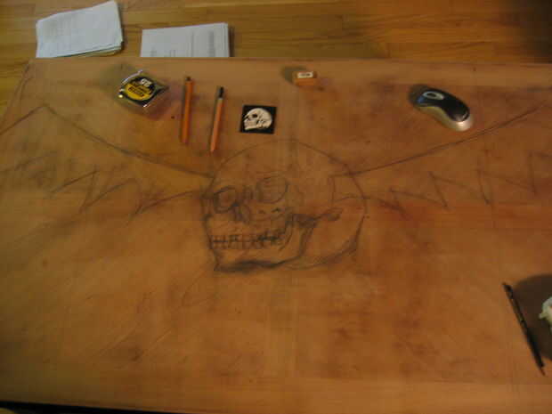 Después de lijar la mesa, dibujó un boceto inicial del cráneo. Un amigo dibujó las flores en la esquina de la mesa. Ella libre una flor patrón en cada una de las cuatro esquinas. Bosquejó el cráneo en lápiz, trabajando desde una tarjeta de visita de un artista de tatuaje local keet. El dibujo cambiado como trabajé en ella en los próximos días, igual que las esquinas de la mesa con las flores. He añadido las alas en el cráneo, que progresó a lo largo del proyecto. Inicialmente, me libre las alas, pero con el fin de hacerlos simétricos que terminó de trazar el ala derecha y trasladarlo a la izquierda más adelante durante el proyecto. En las esquinas de la mesa las flores permanecían, pero agregué la frontera de la vid y más tarde se añadieron las hadas por otro amigo.