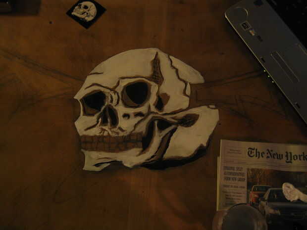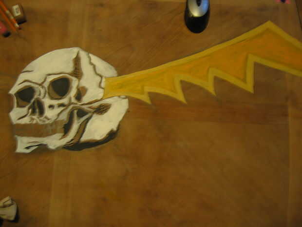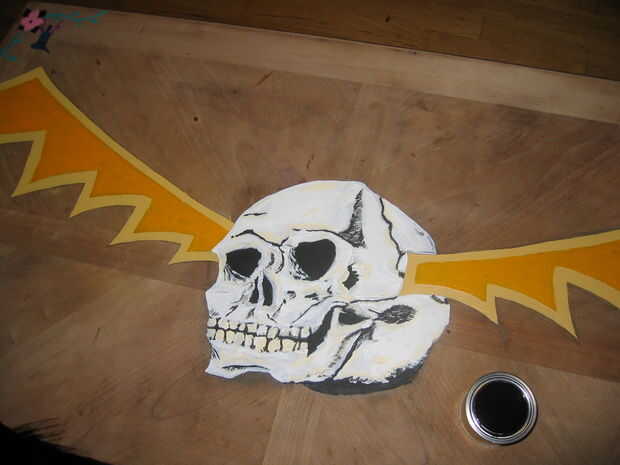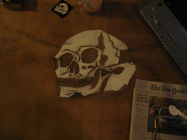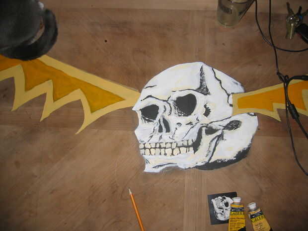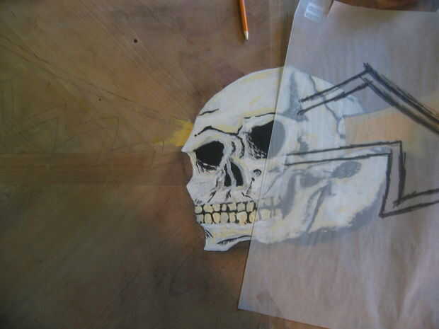Para transferir el ala, remonta a la derecha con una hoja grande de papel con un dibujo a lápiz blando (3B). Luego volcó el papel (de modo que el trazo es cara abajo sobre la mesa) y coloca junto a la calavera. Grabado el papel hacia abajo y luego garabateado sobre el trazo. Esto transfiere el grafito suave del papel sobre la mesa. Después de transferir el ala pinté para coincide con la derecha.