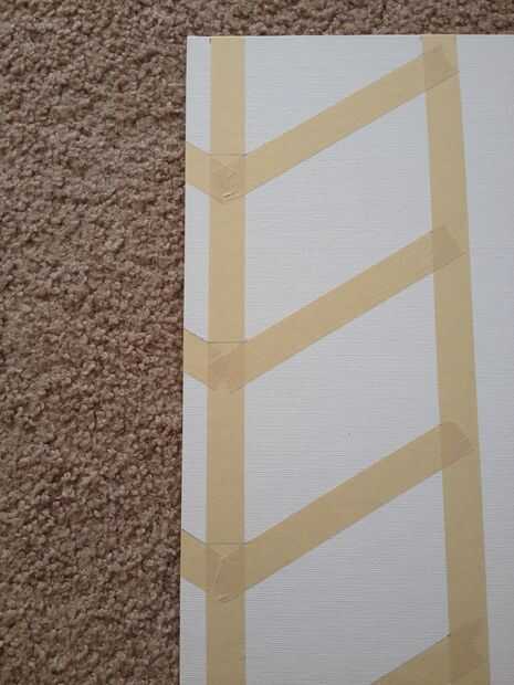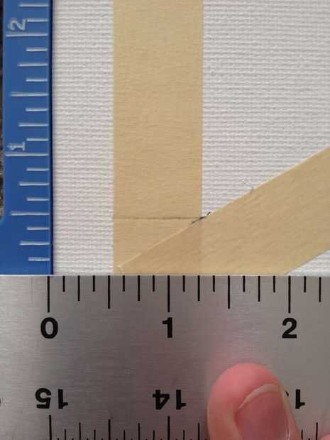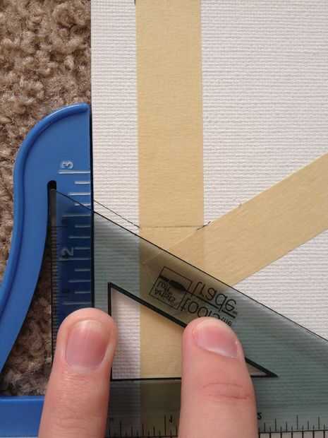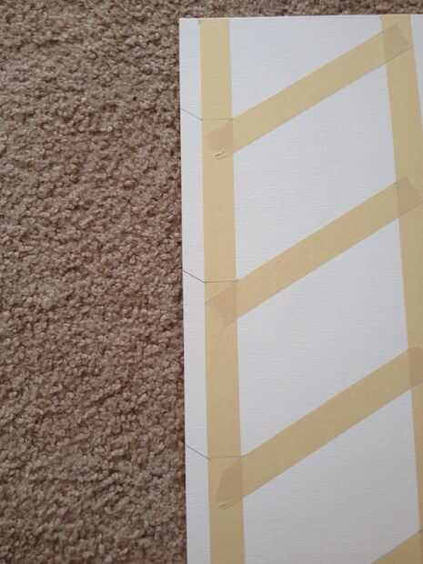 Con su triángulo (volcó) contra la escuadra, hacer líneas diagonales de estas líneas horizontales subiendo, reflejando las diagonales que sólo ha grabado. Hacer esto para cada una de las diagonales hasta llegar a la parte inferior de la lona. Poner tiras de cinta, alineando la parte superior de la cinta con las líneas que ha solo dibujado otra vez envolviendo el exceso sobre la parte posteriora de la lona y asegurándose de no cruzar la pieza vertical de la cinta.