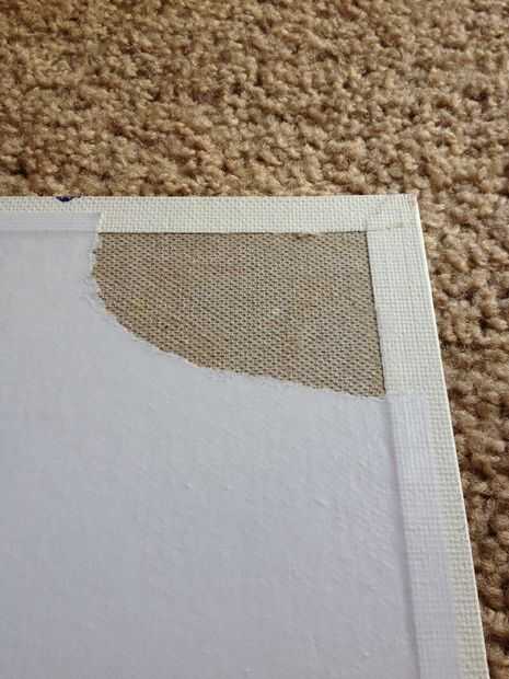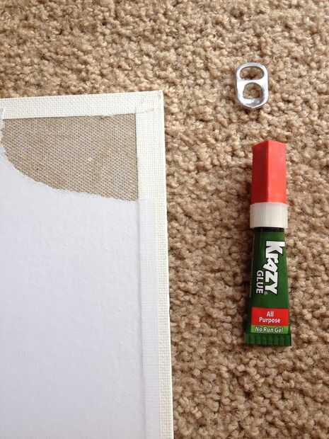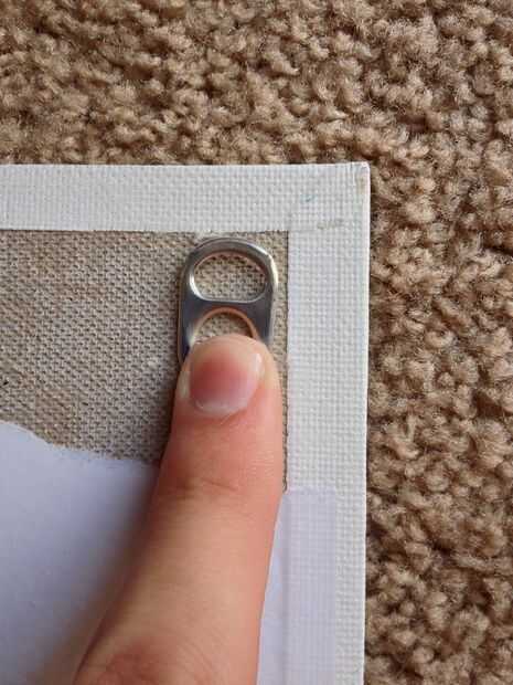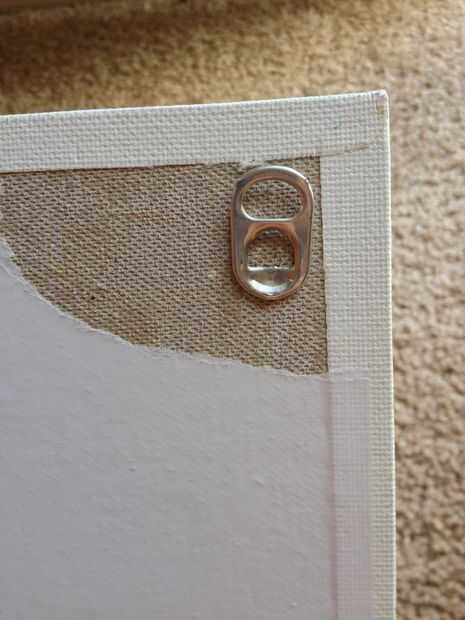 Para este proyecto he utilizado un lienzo plano en lugar de uno con estructura de madera. Aunque estos son más baratos y grandes trabajar con, son un dolor para colgar en la pared. La forma más sencilla que he encontrado colgarlos es muy sencilla usando soda puede tapas y súper pegamento. Estos lienzos tienen un soporte de papel para cubrir el cartón. Extraer este papel en las esquinas superiores no estafan una vez que has colgado tu obra maestra en la pared. Luego aplicar pegamento a la parte inferior de la parte posterior de la parte superior de la soda. Asegúrese de cubrir todos los bordes levantados. Esto es lo que tocarán la parte posteriora de la lona. Una vez que has aplicado el pegamento, coloque la tapa de soda en la esquina de la tela y presione en la parte inferior de la tapa de soda para que se sostiene firmemente sobre el lienzo y la parte superior de la tapa de soda se está pegando fuera de la tela (ver foto). Manténgalo pulsado durante al menos un minuto estar seguro de que se adhiere y luego hacer la otra esquina. Asegúrese de que estén a nivel. Ahora estás listo para colgar su maravillosa obra de arte en la pared con las uñas como cualquier otro lienzo.