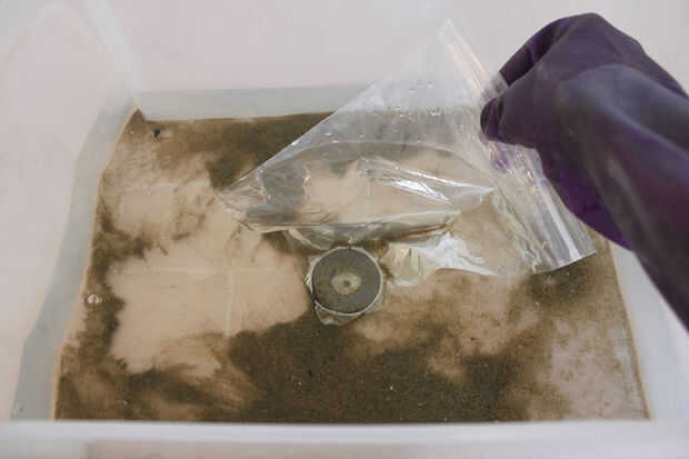 3. una vez que el material es suficientemente suspendido en el agua, suavemente 'rastrillo' el imán en la bolsa de ziplock mediante el uso de agua muy lento movimiento hacia adelante y hacia atrás. Preste especial atención a la región más baja del agua y el fondo de la bañera, pero asegúrese de que es suaves en sus movimientos. Más polvo cósmico que lo hace a través de la atmósfera terrestre está compuesta por hierro y níquel (magnética) y se aferro al exterior de la bolsa.