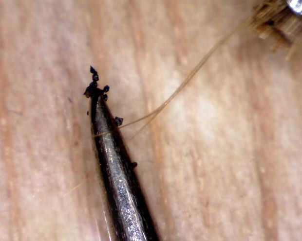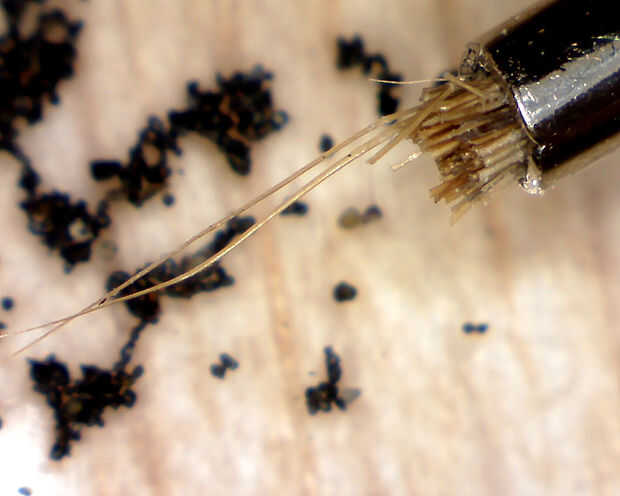 3. Retire todos sino dos pelos de la brocha pequeña. Utilice el cepillo para eliminar el material recogido de la aguja y para mover el material de la diapositiva.