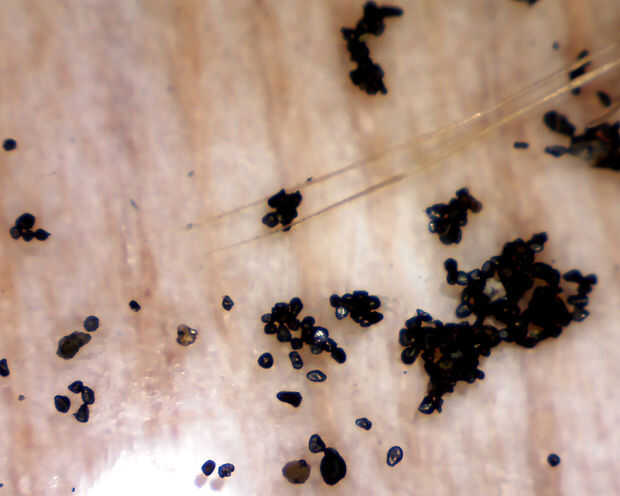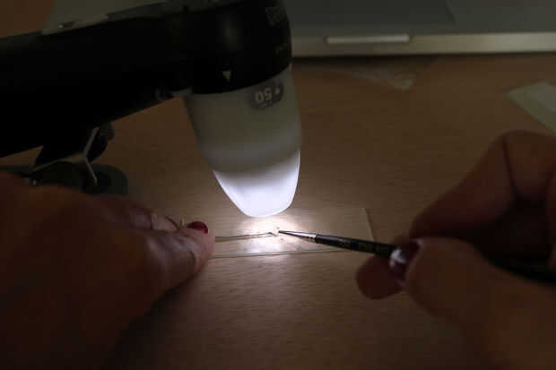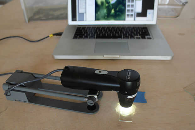 2. colocar el portaobjetos bajo magnificación. Utilicé un microscopio digital USB ProScope que captura imágenes fijas, vídeo y lapso de tiempo directamente a mi ordenador (imágenes que se muestran aquí de la brocha y recogida material bajo 50 aumentos).