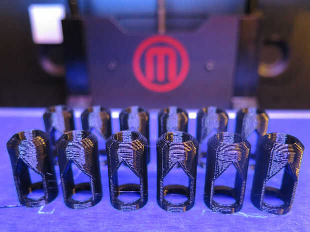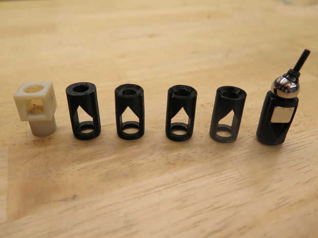 La toma del imán también tiene inserciones de apretado para las varillas de fibra de carbono. En primer lugar he intentado ser cool e imprimir la primera prueba con el Objet Connex 500. Tonterías. Volví a una herramienta más simple y utilizado un MakerBot para repetir 5 veces la parte hasta que tuviera el diseño que se adaptan perfectamente, el imán y los brazos (en menos de una hora).