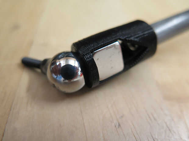 El efector final se conecta a las torres de armas. En el extremo de cada brazo de una Junta de al menos dos grados de libertad debe ser utilizado. Por eso decidí usar bolas juntas sostenga en colocar imanes. Esto permite para montar/desmontar el efector final solo chasqueando las articulaciones de bola de imán. Lo que es fresco y divertido, un ganar-ganar.