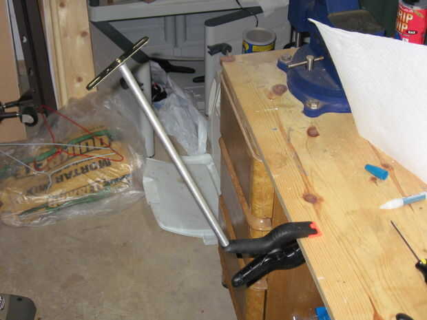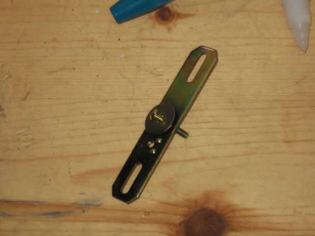 decidí agregar un pedazo de metal en la parte superior para mantener el rodillo de la varilla en caso de dosificación vigorosa. Utilicé un soporte de montaje de una lámpara. Tuve que añadir una arandela a esto para evitar que el tornillo pasa a través del orificio en el soporte. Luego de rosca el tornillo en el orificio roscado en el otro extremo de la varilla. Sólo hice este dedo apretado así que sería fácil de quitar cuando las toallas.
