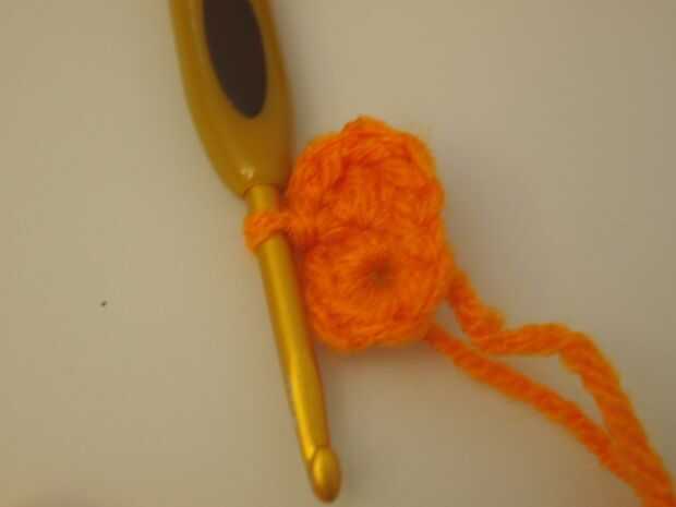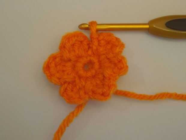 Continuando con el hilo naranja, cadena 1. Luego en la siguiente puntada: doble ganchillo 3, p.de cadeneta, cadena 1. Repita este patrón para los siguientes 4 puntos. En la última puntada de ganchillo doble 3 y puntada de slip (no cadena 1). Esto hace que la primera ronda de pétalos