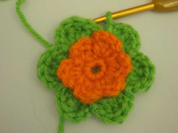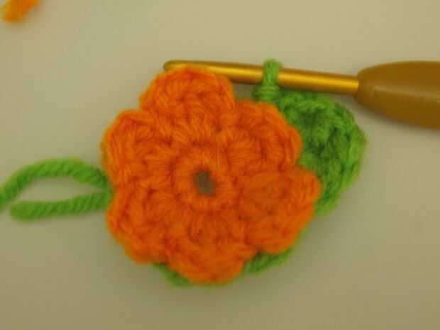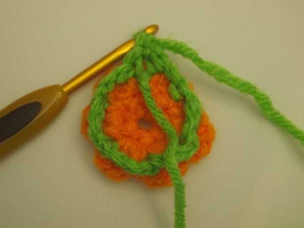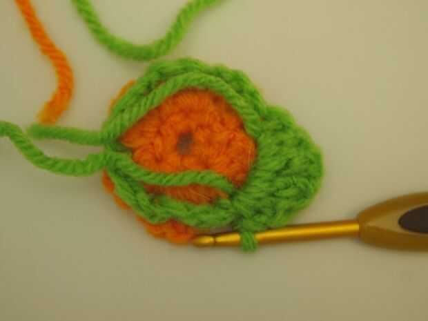 Continuando con el hilo verde, puntada de resbalón en el lazo siguiente sobre. Entonces cadena 1, doble crochet, 2 triple ganchillo, ganchillo doble, cadena 1, puntada de resbalón. Repita este patrón en cada bucle alrededor hasta que tenga 6 pétalos verdes
