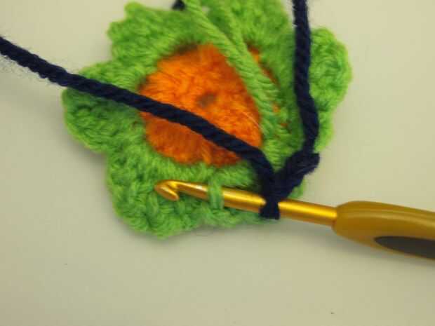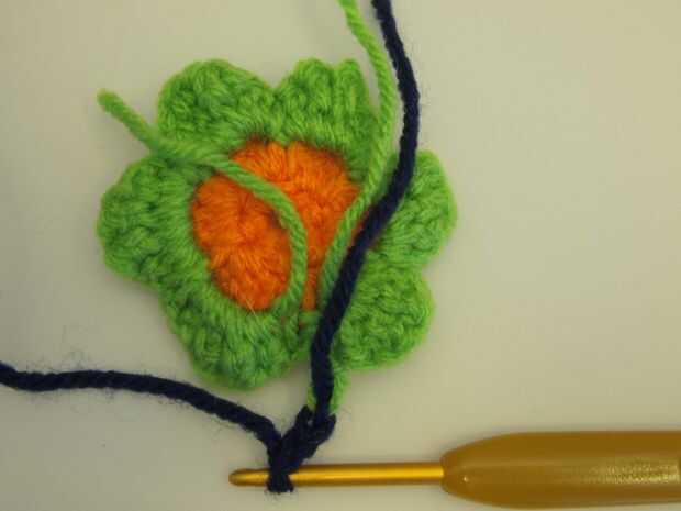 Vamos a hacer otra serie de bucles para su tercer anillo de pétalos, por lo que va ser cambiar colores de hilo otra vez. Voltea tu flor y cortar el hilo verde, dejando una cola para tejer en. Entonces, cambiar a hilado indigo, cadena 4 y ancla con un slip punto en el otro lado del pétalo (igual que para los pétalos verdes). Repetir todo el camino alrededor hasta que tienen 6 lazos indigo.