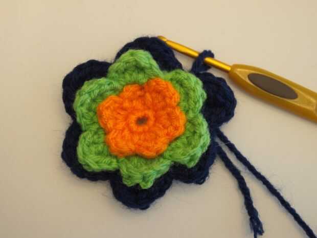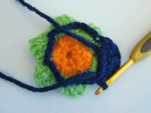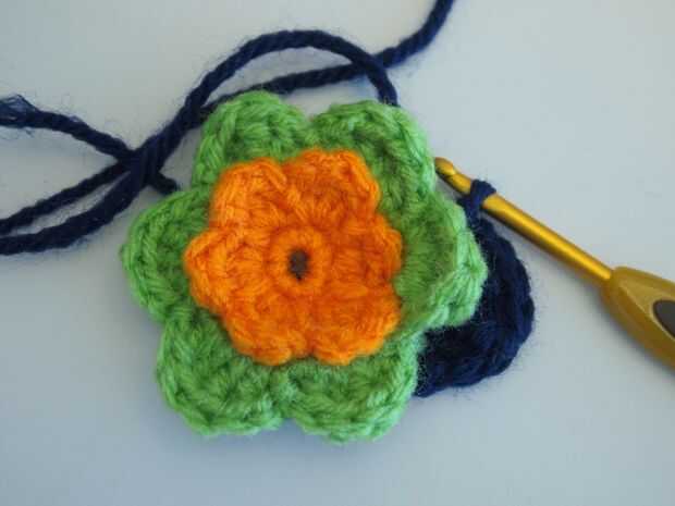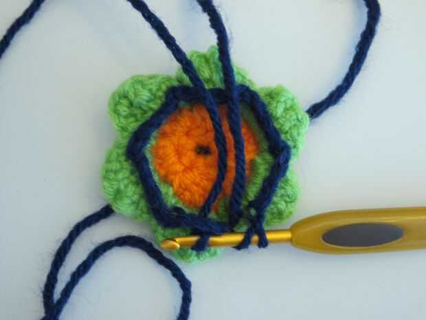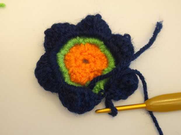 Ahora vamos a hacer los pétalos indigo. Puntada del resbalón en el lazo siguiente encima, entonces (cadena 1, doble crochet triple ganchillo, cuádruple del ganchillo, triple ganchillo, punto alto, cadena 1 y puntada de resbalón) en ese circuito. Repita este patrón para los siguientes 5 pétalos. Cuando termine, cortar su hilo añil y amarra, dejando una cola para tejer en. Son sus pétalos base todo hechos!