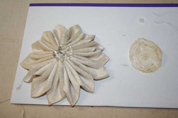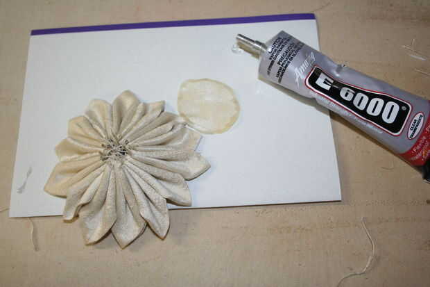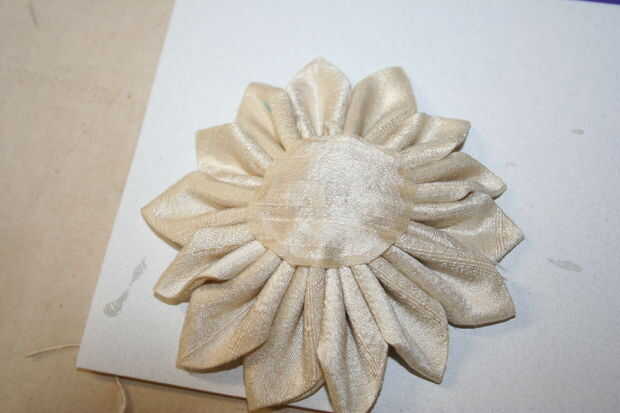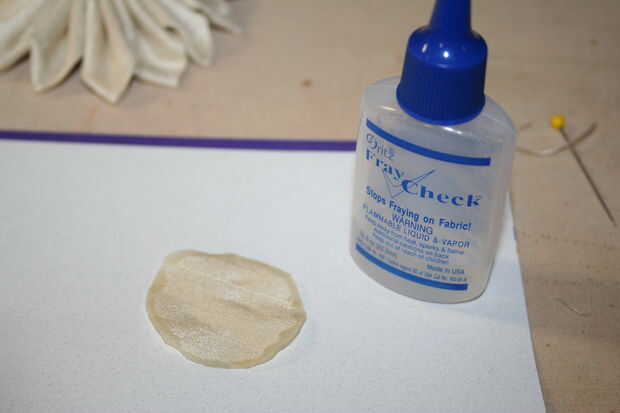 Así que corte un círculo que es lo suficientemente grande como para cubrir los bordes de corte en la parte posterior de la flor y fray Compruebe los bordes. Una vez se haya secado un poco (hará un par de minutos) ir sobre pegado al dorso de su flor.