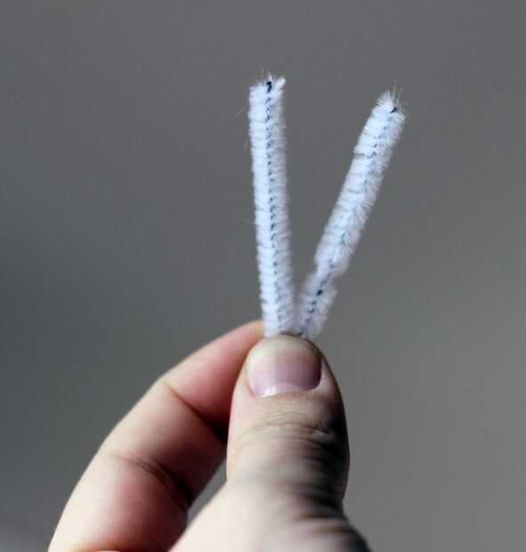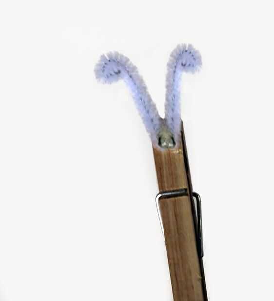 Corte cada tallo de chenille en tres partes iguales. Esto asegurará que usted consigue tantas antenas por tallo de chenilla como sea posible. Doble cada pieza del vástago del chenille a la mitad y luego moldear las puntas encima. Usé unas pinzas para conseguir un rizo más estricto, pero puedes usar los dedos o incluso hacer una espiral! Una vez que han formado sus antenas a tu gusto, utilizar un poco de pegamento caliente para fijar sus antenas a la parte superior de la pinza para la ropa, donde se abre la pinza para la ropa.