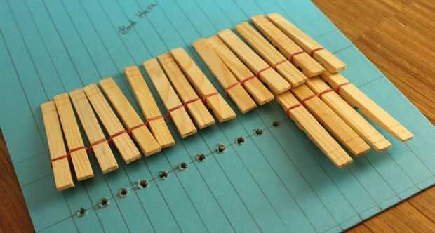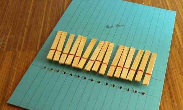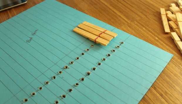Apriete de una banda de caucho a través del primer agujero y dejar un lazo lo suficientemente grande como para caber una pinza para la ropa. Continuar empujando la misma banda de caucho a través de orificios vecinos hasta que se ponga cómodo. En mi espacio entre clave y bandas de goma, pude conseguir 3 llaves por banda de goma.