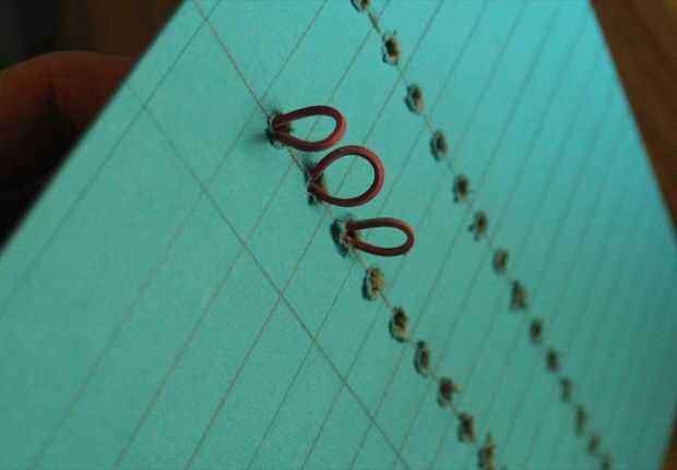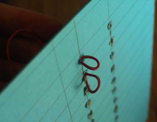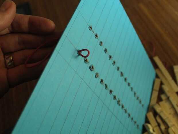 Si tu goma banda un poco floja para el número de agujeros que tienes, solo un nudo en él al otro lado de la cartulina.