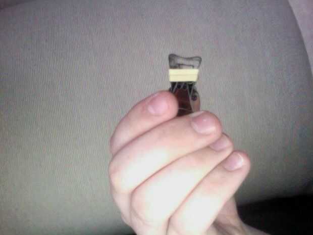 se necesita:Una pinza de ropa (madera)1 banda de cauchoHerramienta de corteHerramienta de la marca (opcional)Paso 1: Desarmar la pinza de ropa Simplemente deslice la parte superior de la pinza de la primavera. Y simplemente sacar el resorte. Ten cuid