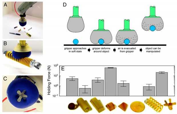 Estamos utilizando este proceso para hacer una pinza robot amorfo. Un globo está lleno de café molido y conectado a una manguera de aire. Cuando globo ligeramente presurizado los terrenos son sueltos y fácil cambiados. Presionando el balón contra un objeto, los motivos se mueven alrededor de él y tomar su forma. Pero cuando el aire es aspirado fuera del globo, los terrenos están comprimidos y agarre el objeto. La superficie de la goma del globo también ayuda a mantener un control del objeto.