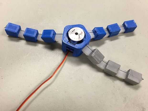 Este es una pequeño, 3D pinza imprimible, robótica que funciona mediante la combinación de materiales suaves con materiales rígidos para crear una estructura articulada que puede accionarse por cadena conectada a un motor de servo. La idea fue inspirada por los dedos de la SDM encontrados el Suave Robotics Toolkit.