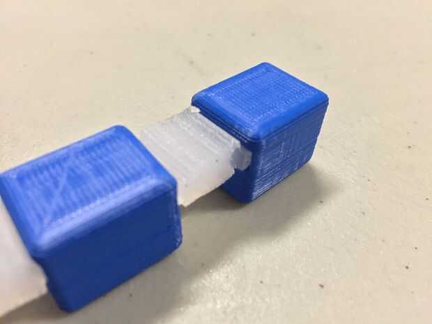 Ahora es el momento para construir los dedos y sujete a la base. Empiece por tomar una pieza de extremo y pulsando una de las piezas de silicona en el hueco rectangular en un lado de él. Es útil usar un objeto pequeño, Romo para empujar. No use instrumentos afilados. Luego, fije una de las piezas medianas a lo que se ha montado hasta ahora. Continuar el proceso hasta que el dedo se ve como la imagen. Repita este paso hasta tener 3 dedos. Presione los extremos de cada uno de éstos en las partes de la base.