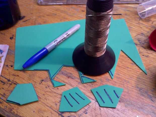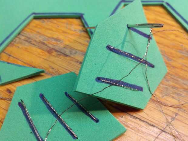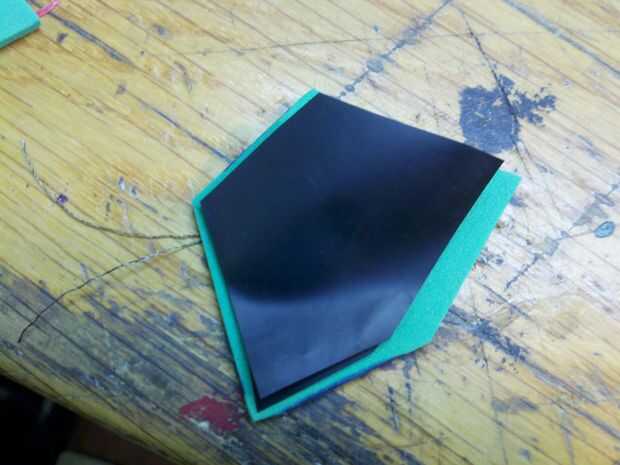 En lugar de coser los bordes juntos, utilicé cemento de 527 Bond multiuso. Es flexible y se adhiere también a la espuma. El hilo conductor fue cosido en un patrón entrecruzado como describe Plusea. La capa media de Velostat se cortó más pequeña que las piezas exteriores para que el pegamento no se adhiere a él y causan compresión. Velostat está disponible en el sitio de seguridad de la EMF.