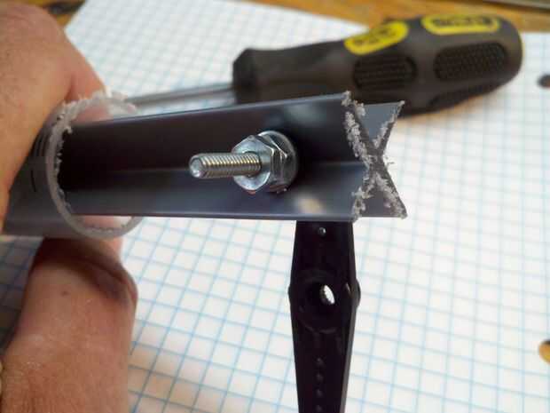 Perforé un asimiento en el brazo del servo y el émbolo. Un tornillo #6 con arandelas y tuercas tiene el émbolo muy estable como el servo tira atrás y empuja hacia adelante.