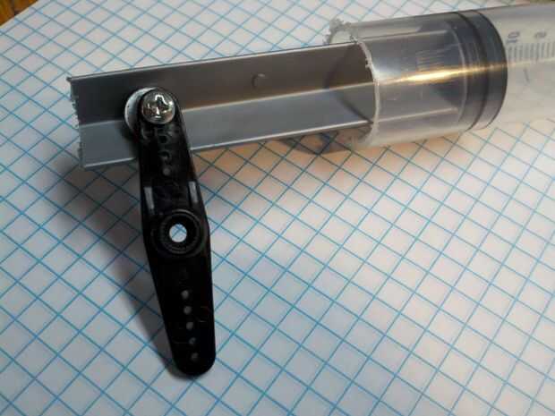 Un pedazo de barra aluminio plana hecho la jeringa de la ayuda. El apoyo tiene que rotar cuando el émbolo se mueve, así que puse un #6 Tornillo para sujetar el cañón y otro tornillo en el canal U. El perno de canal de U no fue ajustado para que todo el conjunto puede girar.