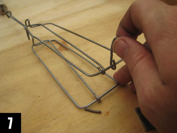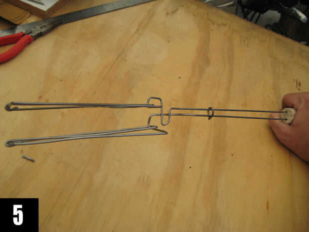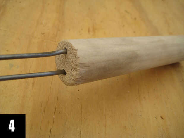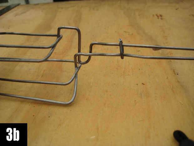 4. Coloque el extremo de la manija del alambre de la parrilla superior al orificio superior de la madera.