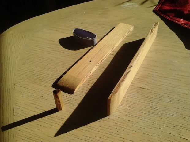 bien, todo lo que necesita es algo de madera y una goma. la madera que utilicé era bambú, de una antigua Tajo que había comenzado a dividir. Estoy seguro de que usted puede usar cualquier madera, pero probablemente sería alojarte de if madera tratada que va a ser manejar los alimentos con ellos. Corté mi 2 secciones, 1-1/4" de ancho por 9" de largo, usted puede hacer cualquier tamaño que desee. Yo también cónica los extremos hacia abajo, para facilitar deslizar en su comida, o lo que es el tratar de recoger. entonces yo cortar pequeña cuña 1-1/4 "x 1/4" y disminuido hacia atrás.