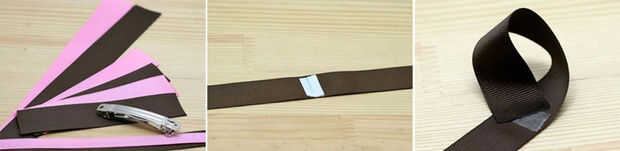Cortar dos cintas de 9cm; cuatro cintas de 6cm y dos cintas más pequeñas de 9cm. Pegar una cinta de doble cara en medio de la cinta de ancho 9 cm. Haga un bucle con un extremo pegado a la mitad.