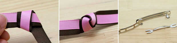 Hacer la cinta de la parte superior hacia abajo a través del lazo y atar las cintas. Ajuste el ángulo superior apretando ligeramente. Abra un clip de pelo.