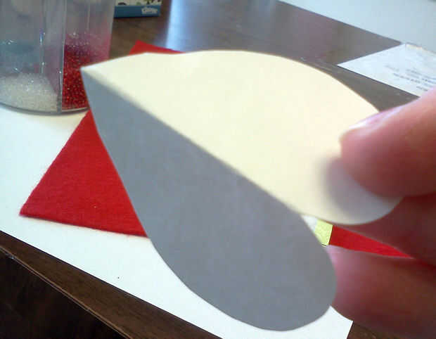 Lo primero es lo primero. Tienes que hacer un corazón, y la mejor manera de hacer esto (y mantenerlo simétrico) es doblar un pedazo de papel por la mitad y cortar hacia fuera. Cuando se realiza y tiene el tamaño correcto que usted desea entonces colóquela sobre un trozo de cartulina (u otro material de papel más grueso). Luego trace y corte hacia fuera. Voy a tirar esto por ahí, así... No use las misma tijeras que utilizas para cortar material, fieltro e hilo para cortar el papel. Eso realmente arruinar el filo de la cuchilla después de un tiempo.