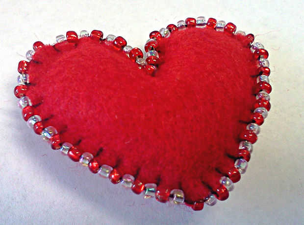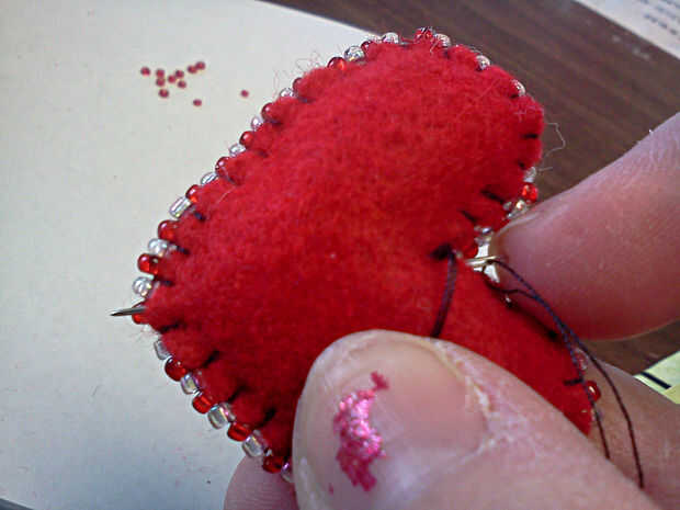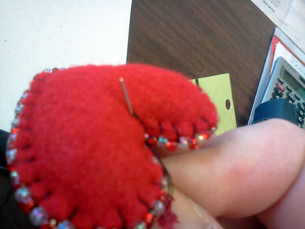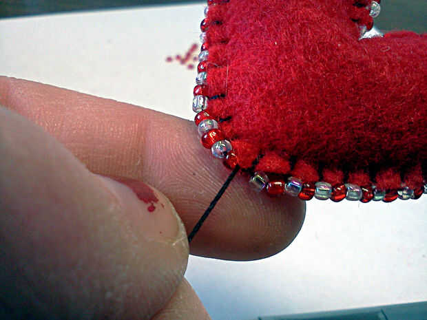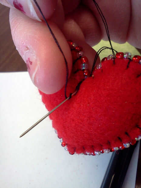 So...  Ahora que se remonta a los inicios.  Si usted con huecos que es genial... sólo asegúrese de que sale incluso si encontráis en el centro.  Ahora inserte la aguja un poco hacia abajo en la parte posterior del corazón.  Envuelva el hilo alrededor de él un par de veces y tire firmemente para hacer un nudo.  Luego insertar la aguja entre las capas de la remolque fieltro y la aguja a través del meneo hasta que se muestra a través entre las dos capas de fieltro en la parte inferior del corazón.  Tensar la cuerda un poco y con cuidado cortar el hilo.  Sólo al final se escondió dentro de su corazón!  La última foto es justa después de que usted corte el hilo.