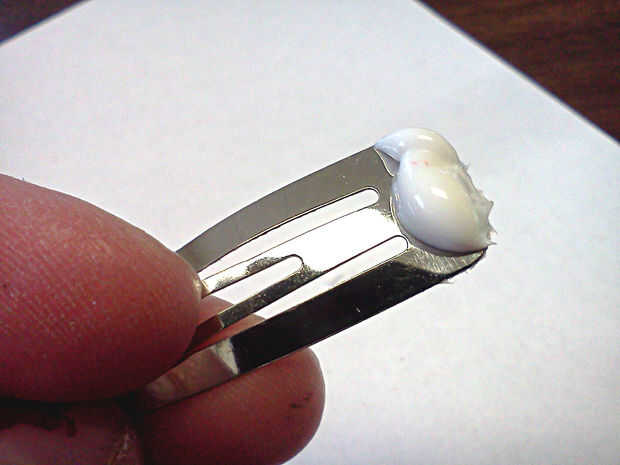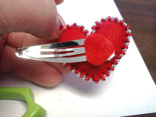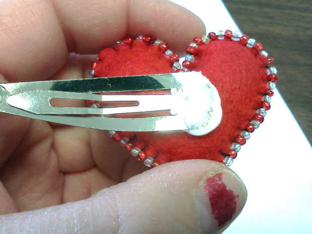 Poner algunos Loctite en ambos lados de la pinza. Coloque el clip en el corazón como se muestra y luego añadir un trozo de fieltro (después de darle forma un poco) a lo expuesto del pegamento y presione firmemente hacia abajo. Te recomiendo un lugar donde poner los clips para secar. Tarda Loctite sobre una hora para formar un conjunto suave y 24 horas para el sistema completo. Este pegamento significa negocio también. Le di algunos clips a una amiga cuya hija es NOTORIO para rasgarse encima de todo su pelo. Ha tenido un clip de la flor que le hice hace 6 meses y no he tenido que reparar todavía.