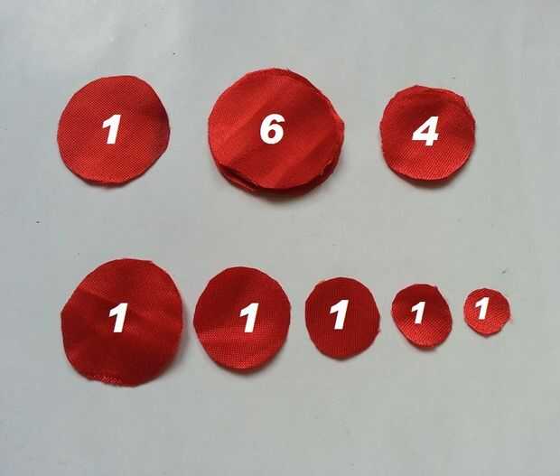 Para la primera capa corte 6 trozos redondos del mismo tamaño de la tela del satén,
