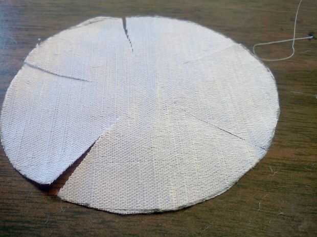 El material de trazar y cortar el círculo (FYI eso transportador exacto no funciona en tela).  Ahora necesitas hacer 5 cortes en ella para los pétalos.  Trate de espaciar uniformemente (no necesita ser perfectamente espaciadas... variando se mira mejor de todos modos).  No cortar hasta abajo... como en la fotografía superior.