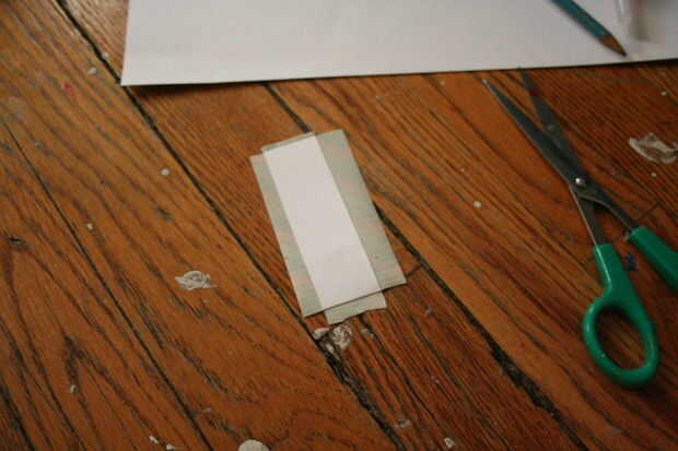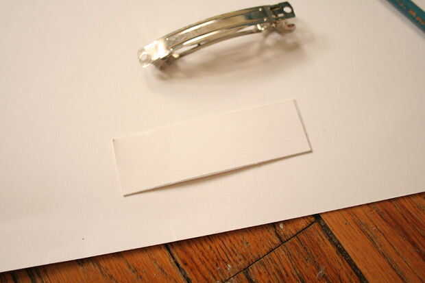 Comienza por la medición de una pieza de cartulina un poco más grande que su pinza de pelo, luego cortar el rectángulo. Desde allí, sacar un trozo de cinta adhesiva y cubrir el rectángulo de cartulina con él. Sugiero que usted corte las esquinas de la cinta, para que camino va a ser mucho más fácil de plegar.