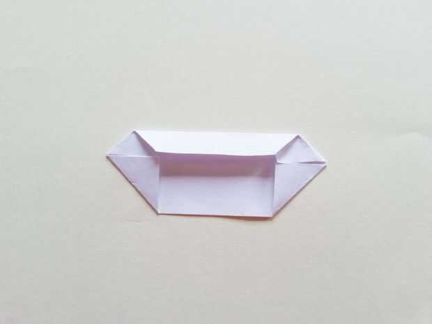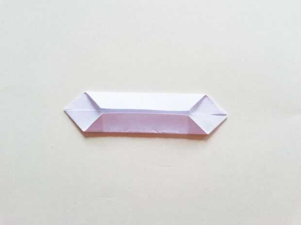 Doblar los bordes restantes en el centro, otra vez usando el primer doblez como guía. Repita los pasos 3 a 5 hasta que haya 3 formas plegadas como en la imagen.