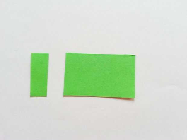 Repita el paso 2 con los cuadrados verdes. Otra vez sólo necesita 3 de los rectángulos. Corte aproximadamente 1cm de un extremo de cada rectángulo y desechar la pieza más pequeña.