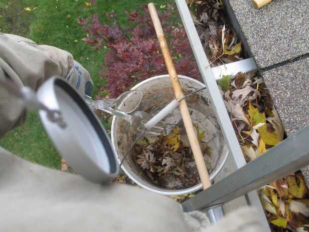 Caída de los escombros en un viejo cubo de lodo yeso, o equivalente, colgando de la escalera en un palillo o un pasador. Repita para la otra mano lo que puede llegar, y luego mover la escalera a lo largo. Disponer de los desechos en componer el montón de basura de la yarda. un montón de nutrientes orgánicos en canal ensalada... disfrutar