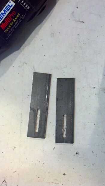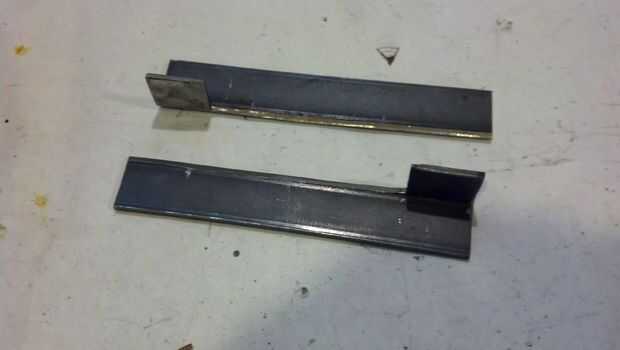 Para hacer las piezas base, querrás terminar con 2 tramos de ángulo de acero, cada uno aproximadamente 6 pulgadas de largo, con más de un lado con muescas hacia fuera (pero deje al menos 1 pulgada). Es más fácil trabajar con una mayor longitud por lo tanto, si es posible, hacer muescas en primera y luego cortar a la medida. Ver la imagen de lo que usted debe terminar con. Recuerde que la base de las piezas son idénticas y no imágenes de espejo uno del otro.
