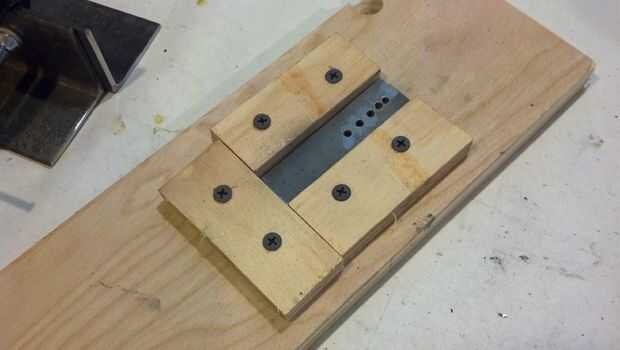 Perforación en tales pequeñas piezas de acero es difícil puesto que la obra quiere "helicóptero" o spin, poniéndole en riesgo de lesión. Para hacer esto con seguridad construí una plantilla simple con chatarra planchas de madera para mantener las cosas en su lugar. La plantilla también resultada para ser útil para el paso de la Dremel ya que todo lo podía sofocar.