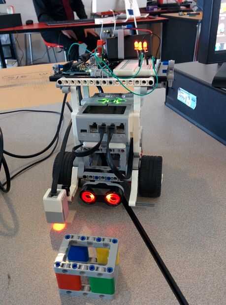Este proyecto, llamado al pionero de la noche, permite al propietario navegar por su casa en la oscuridad sin molestar al resto de los ocupantes en el hogar. El Pathfinder consta de dos secciones principales, un chasis principal, (formado por ladrillos de Lego Mindstorm) y una placa Arduino. Durante toda la noche, la placa Arduino actúa como una luz nocturna, proporcionando luz suficiente y garantizar que el robot se encuentra fácilmente en lugares oscuros. Activación del código en la interfaz de Lego, el robot seguirá un preajuste de color línea (azul por defecto), hasta que el robot ha detectado un obstáculo que obstruía su camino, tal como una pared. Al comienzo de cada noche, el usuario sólo tiene que encender las luces de la decoloración en la placa de Arduino, proporcionando fácil usar durante la noche.